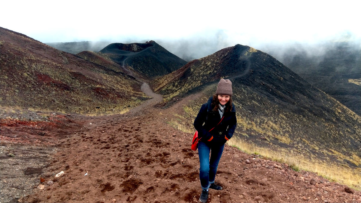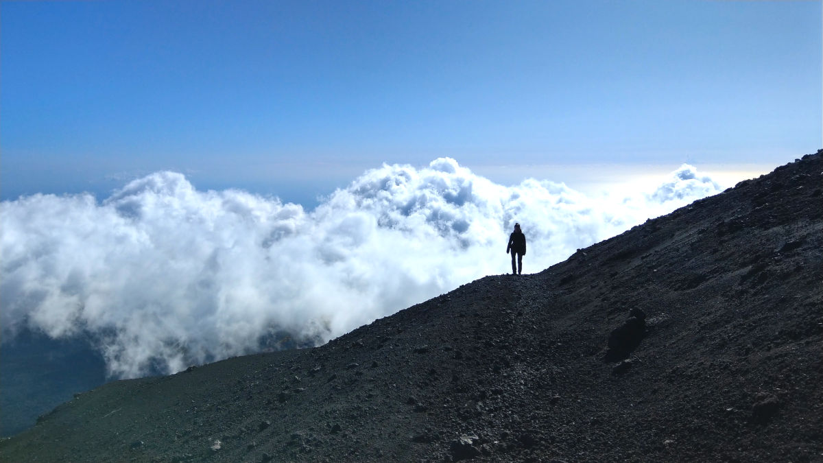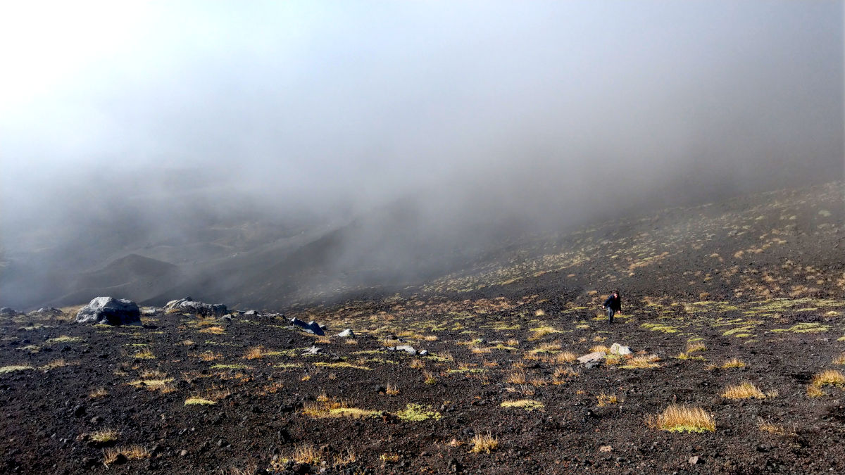 For a summit attempt of Etna volcano we set out from the parking area of Rifugio Giovanni Sapienza. We take a foot path east of the main road and enjoy the scenery. We start below the cloud level and climbing slowly up reach the clouds.